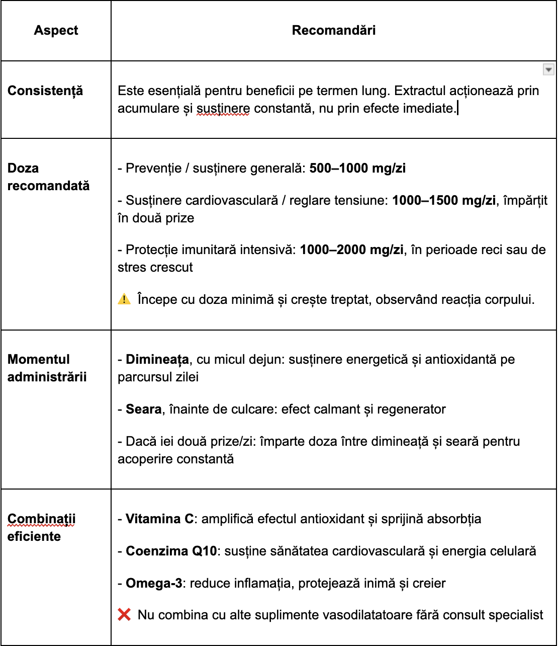 Da, dar cu precauție. Combinațiile cu vitamina C, omega-3 sau coenzima Q10 sunt sigure și sinergice. Evită combinarea cu alte suplimente vasodilatatoare sau anticoagulante fără consult medical.